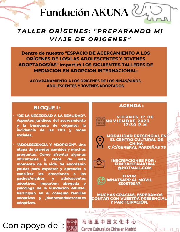 Dentro de nuestro “ESPACIO DE ACERCAMIENTO A LOS ORÍGENES DE LOS/LAS ADOLESCENTES Y JOVENES ADOPTADOS/AS” impartirá LOS SIGUIENTES TALLERES DE MEDIACION EN ADOPCION INTERNACIONAL: ACOMPAÑAMIENTO A LOS ORIGENES DE LOS NIÑAS/NIÑOS, ADOLESCENTES Y JOVENES ADOPTADOS.